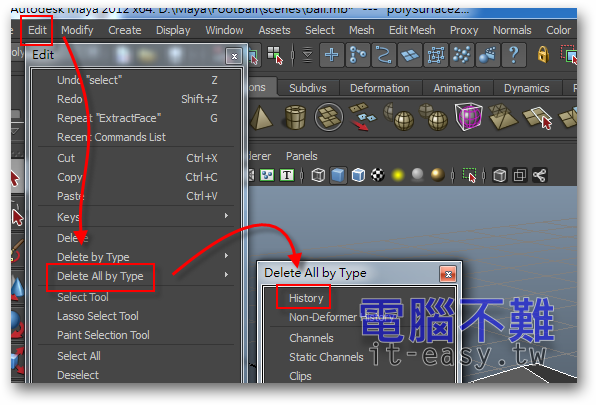 第9步 在指令選單列「Edit->Delete All by Type」中,執行「History」指令,將選取中物件的歷史紀錄刪除,讓物件變乾淨,較不易出錯。在Maya中物件執行過的任何指令都會留下歷史紀錄,方便在之後隨時更改,這些紀錄可能會影響到其他指令的操作,因此在確定物件不會再修改該指令的設定後,應保持良好的習慣將歷史紀錄刪除,避免怪問題的發生。