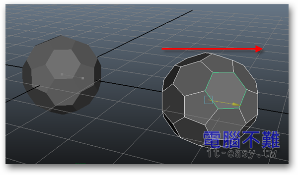 第10步 刪掉歷史紀錄,才算真正將面分離式的Soccer Ball給做好。因為過程十分費工夫,接下來的步驟如果做錯了要重來很花時間,所以還是先將Soccer Ball給全選,按下快速鍵「Ctrl+d」,在原地複製出另一個Soccer Ball。並利用快速鍵「w」叫出位移工具,將其移動到旁邊保存。這樣一來,如果不小心把一顆Soccer Ball做錯,旁邊還有一顆拆好的Soccer Ball備用。