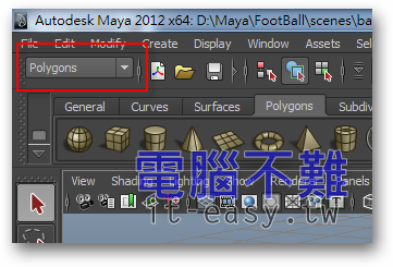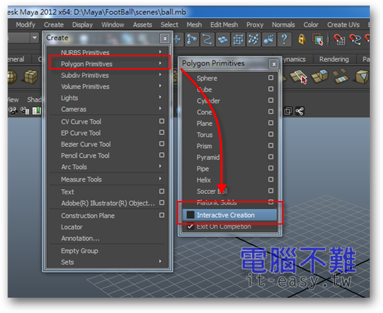 第2步 在指令選單列「Create->Polygon Primitives」中,把「Interactive Creation」取消勾選,如此一來Polygon(多邊形)物件會以預設的單位大小和位置來產生,方便接下來的動作。
