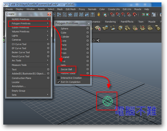 第3步 同樣在指令選單列「Create->Polygon Primitives」中,執行「Soccer Ball」指令,產生出一個Soccer Ball物件(pSolid)。