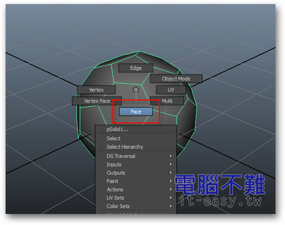 第1步 在Soccer Ball上按住滑鼠右鍵,拖曳到「Face(面)」的地方,進入選面模式。