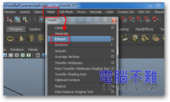 第4步 執行「Mesh」分類中的「Extract(提取)」指令,將選取的面從所屬物件中拆下來,獨立成另外的物件。