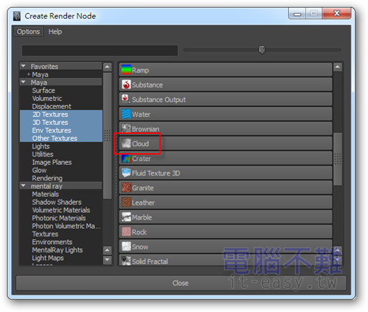 第6步 在Create Render Node視窗中,選擇「Cloud」(雲)。用來製作星球的雲層透明度。