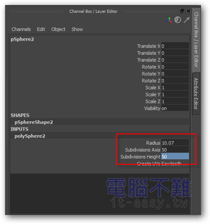 第2步 選取剛才新增的Sphere物件,在Channel Box裡修改polySphere歷史紀錄中的Radius和Subdivisions(分部)屬性。將Radius設為「10.07」,Subdivisions的所有項目均改為「50」。你可能會覺得奇怪,這樣設定的話剛才那顆Sphere不就被擋住了嗎?沒錯,就是要讓第二個Sphere,來包住第一個Sphere。