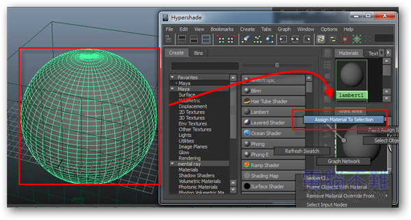 第4步 選取剛才新增的Sphere。再回到Hypershade視窗,在剛才新增的Lambert材質球上按住滑鼠右鍵,拖曳到「Assign Material To Selection(將材質指定給選定對象)」。