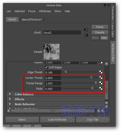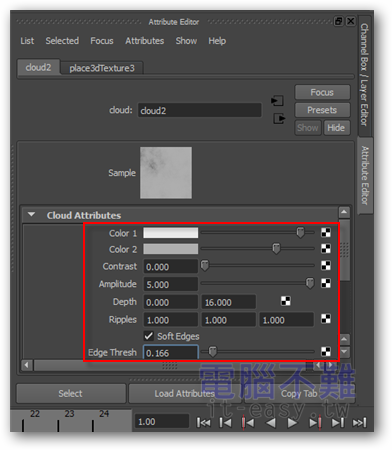 第7步 來到Cloud的Attribute Editor畫面,修改Color 1為接近白色、Color 2為灰白色。這裡的顏色,愈白表示雲層愈透明。Contrast(對比)設為「0.000」;Amplitude(幅度)設為「5.000」;Depth(深度)設為「0.000」和「16.000」;Edge Thresh設為「0.166」;Center Thresh設為「0.869」;Transp Range設為「1.000」;Ratio(比率)設為「0.900」。