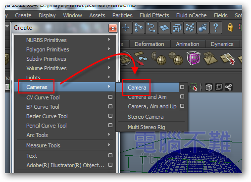 第1步 習慣上,我們會比較喜歡新增另一台Camera(攝影機)來進行設定,而不去更動原本的預設攝影機(persp)的設定值。故我們需要從指令選單列「Create->Cameras」中,新增一台「Camera」。