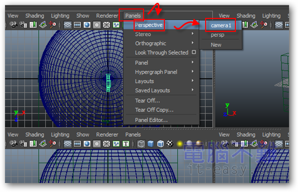 第2步 按下空白鍵切換到四視圖,隨便找一個框架面板,將其視角改為Camera。按下「Panels->Perspective->camera1」。