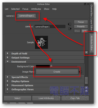 第4步 按下快速鍵「Ctrl+a」,開啟「Attribute Editor」。來到「cameraShape」標籤,在Environment分類中找到Image Plane項目,按下「Create」按鈕。