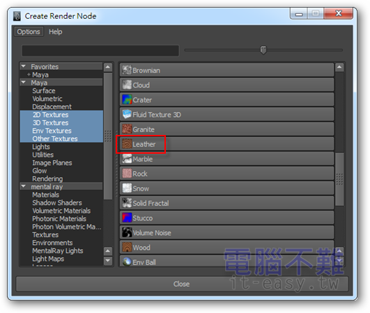 第7步 在Create Render Node視窗中,選擇「Leather」(皮革)。用來製作充滿星星的宇宙背景。