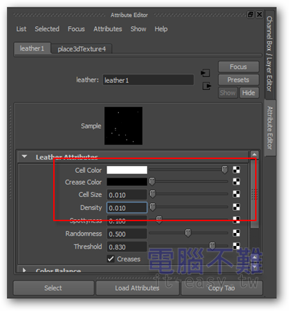 第8步 來到Leather的Attribute Editor畫面,修改Cell Color為白色、Crease Color為黑色。Cell Size設為「0.010」;Density(密度)設為「0.010」。