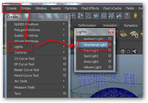 第1步 指令選單列「Create->Lights」中,新增一個「Directional Light」(直線光源)。