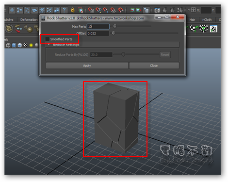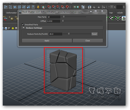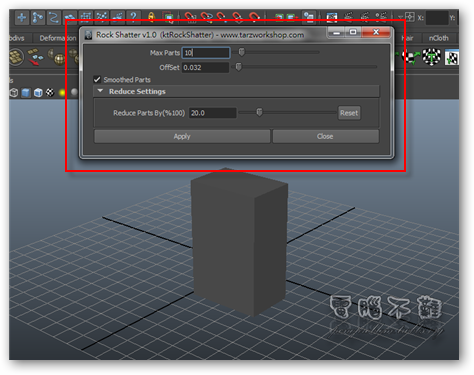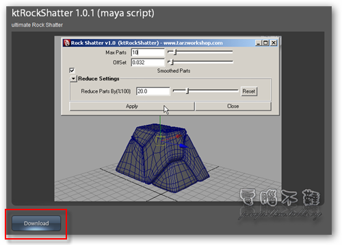 ktRockShatter的設定很簡單,無需做太多的介紹。但要注意到,面數愈多的模型,碎裂出來的數量愈多的話,電腦運算的速度就會愈慢喔!