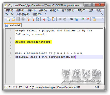 如果有txt檔案建議先閱讀,它會告訴你腳本的使用方法。下圖中黃色的部分,就是要在Maya中開啟ktRockShatter時需要輸入的指令。