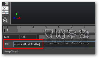 在下方mel可以輸入指令「source ktRockShatter」後,按下鍵盤的「Enter」鍵,玩玩看剛才加進來的ktRockShatter。