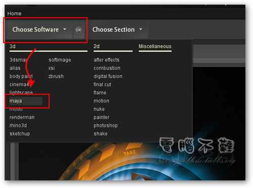 登入會員之後,來到Creative Crash的首頁,將滑鼠游標移到「Choose Software」上,出現選單後,點選「maya」。