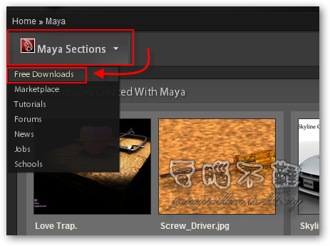 Creative Crash網站上提供的檔案有分付費和免費的,其實免費的就很好用了,如果有特殊需求,再去花錢買吧!將滑鼠游標移到「Maya Sections」上,出現選單後,點選「Free Downloads」(免費下載)。