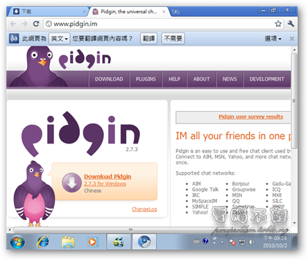 當按下「連結到Pidgin」按鈕時,便會連結到Pidgin的官方網站。