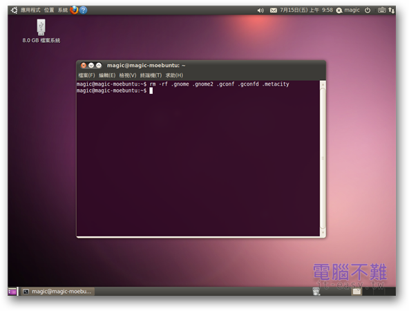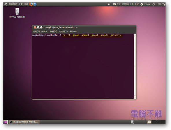 在設定之前最好能先在終端機執行下面指令,將Gnome的設定檔移除,回到預設值,確保你我的畫面是一樣的。