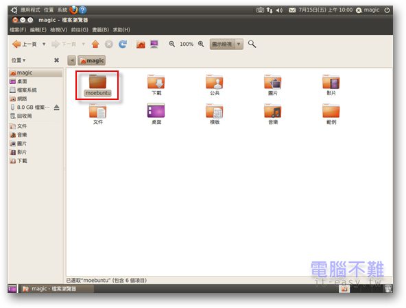 接著再將下載下來的壓縮檔中的「moebuntu」資料夾解壓縮到家目錄(~/)下。