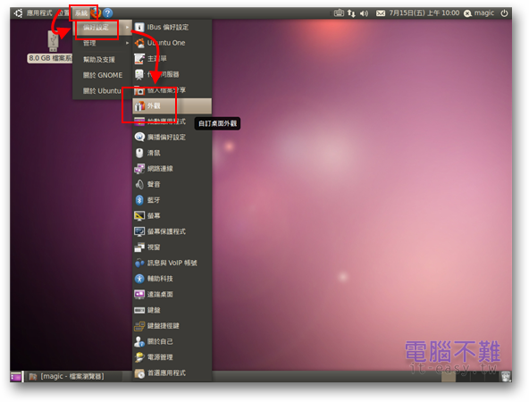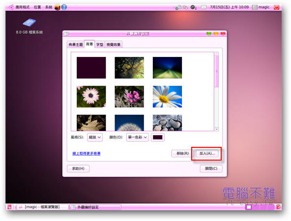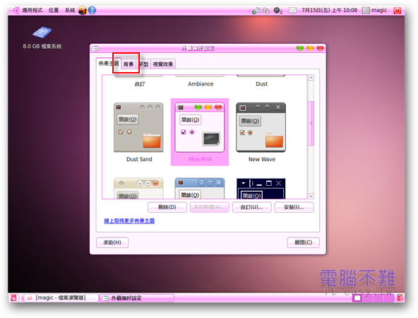 步驟八 再來會發現Gnome面板變成粉紅色了(>///<)。此時進入「背景」標籤頁,要來設定背景圖片。