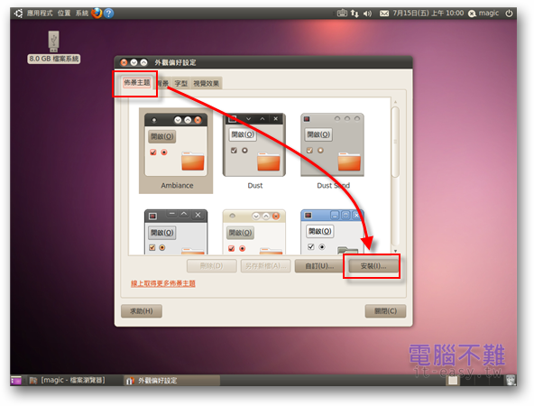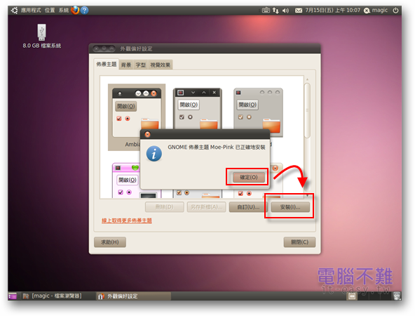 步驟四 然後出現Gnome佈景主題已正確安裝的訊息,回到外觀偏好設定視窗的「佈景主題」標籤頁,再按下「安裝」按鈕。