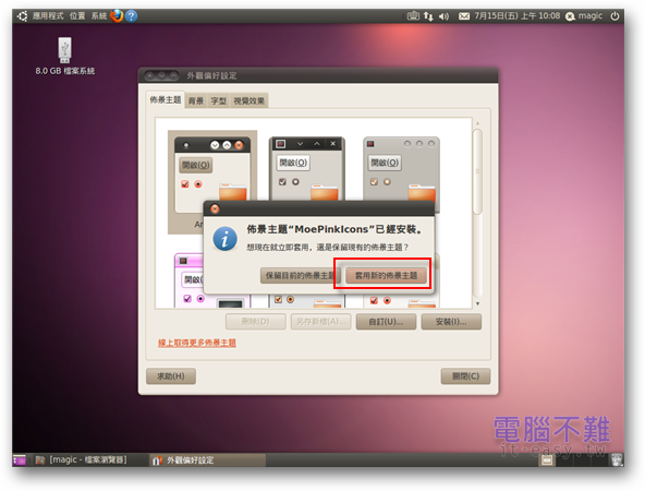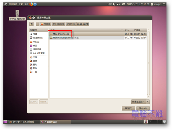 步驟三 加入「moebuntu/themes/moe-Pink/Moe-Pink.tar.gz」,這是佈景主題的檔案,當然也可以加入其他主題檔。