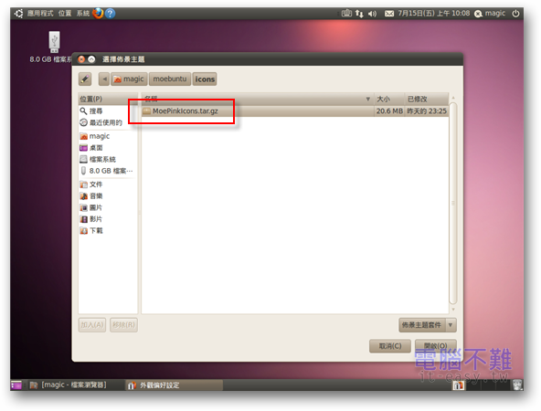 步驟五 加入「moebuntu/icons/MoePinkIcons.tar.gz」,這是佈景主題圖示的檔案,當然也可以加入其他圖示檔。