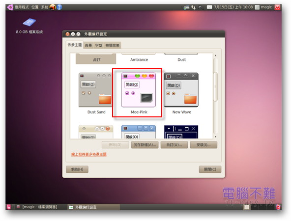 步驟七 同樣在「佈景主題」標籤頁下,反白選擇「Moe-Pink」主題。