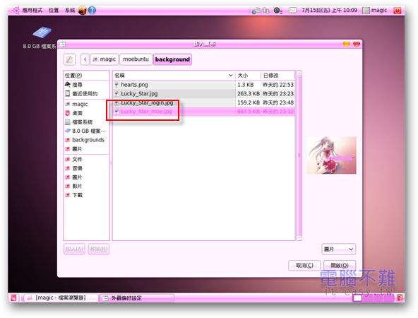 步驟十 加入「moebuntu/background/Lucky_Star_moe.jpg」,這是我將原圖(Lucky_Star.jpg)自行加上moebuntu的LOGO(moebuntu_logo.png)所製作而成的背景圖。當然也可以自行設定其他喜歡的圖片為背景圖,如果想要在圖片內加上moebuntu的LOGO,可以使用GIMP來合成製作。有關使用GIMP加入LOGO的方法,在本篇文章最後會提到,需要者可以先跳至到最後一頁來看。另外在此分享一個下載萌背景圖片的網站 theAnimeGallery.com。