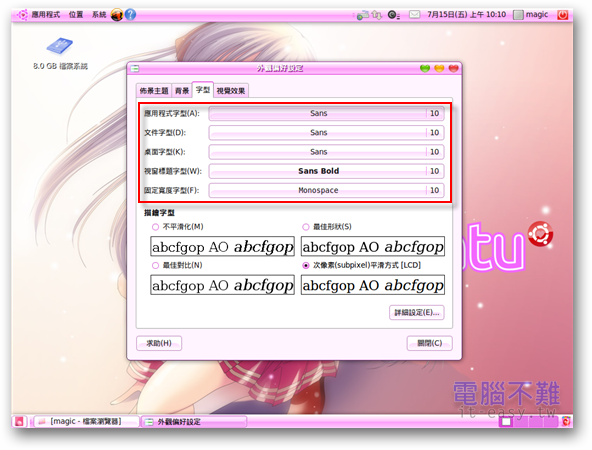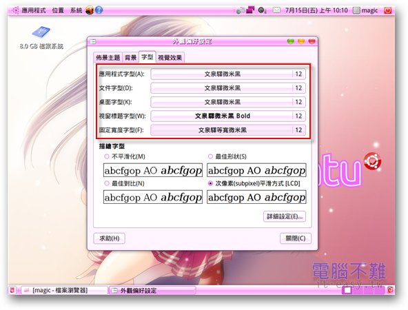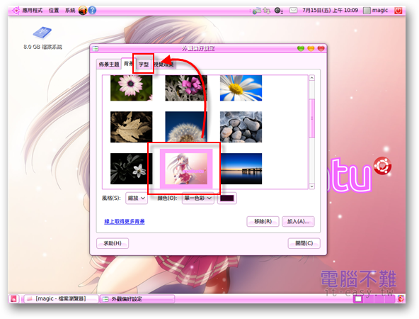 步驟十一 在「背景」標籤頁下,反白選擇剛才加入的萌圖。接著進入「字型」標籤頁,順便調整一下Gnome的顯示字型。