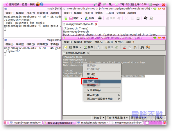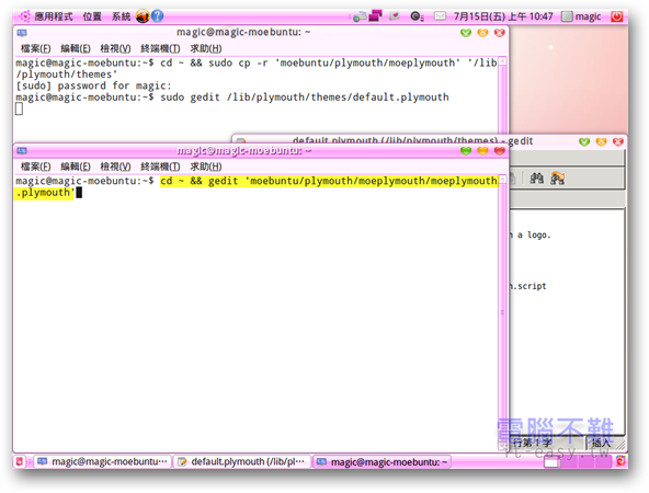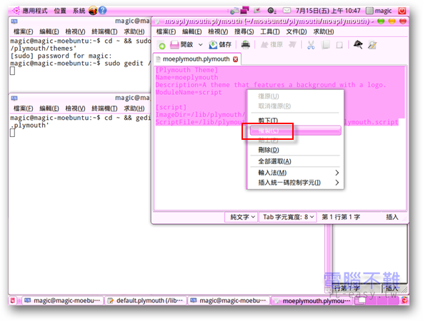 步驟二 再在終端機輸入以下指令,用gedit編輯預設的Plymouth主題。