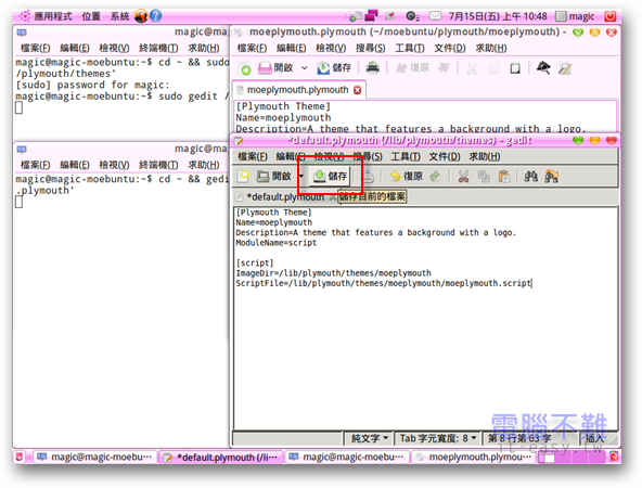 步驟六 儲存default.plymouth。然後就可以將兩個gedit畫面關閉了。