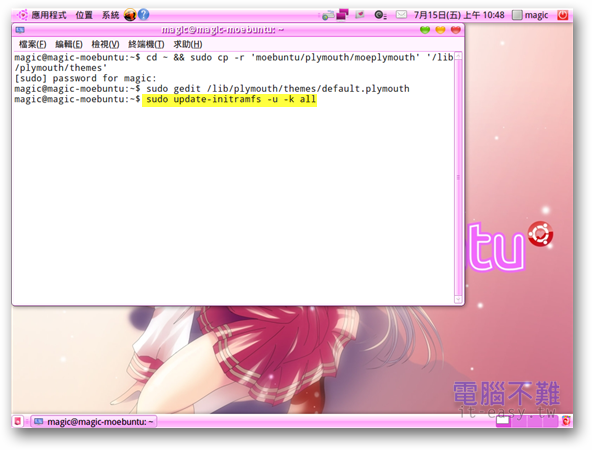 步驟一 在終端機輸入以下指令,把另一個moebuntu的Plymouth開機畫面主題資料夾(moeplymouth)複製到「/lib/plymouth/themes/」目錄中。在複製之前也可以將moeplymouth資料夾內的「moebuntu_bg.png」更改為自己想要的背景圖。