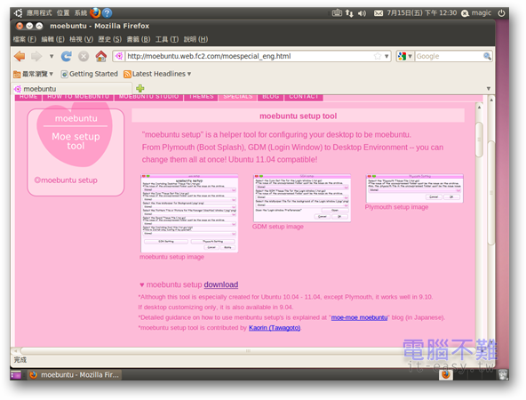 事實上moebuntu官方有為Ubuntu 10.04以後的版本提供一個快速安裝moebuntu主題的工具。