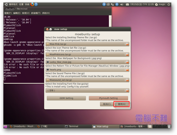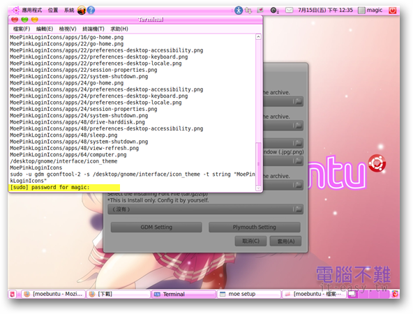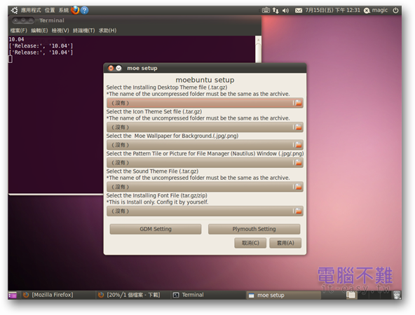 用這種方式安裝moebuntu主題雖然快速,卻也很容易出問題,例如登入畫面失效或是開機畫面依然為16色。我是比較喜歡自己動手做,可以練習Ubuntu指令,也可以清楚知道發生問題的問題點在哪,當然會花上不少時間倒是真的!