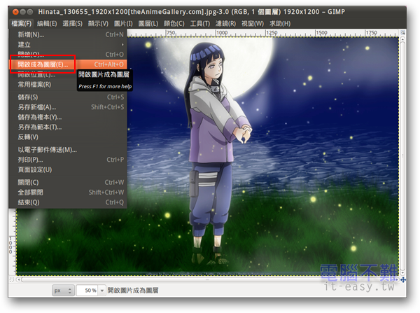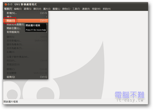 步驟一 使用GIMP「開啟」一張喜歡的圖片。