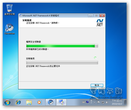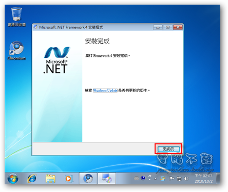 接著等待安裝程式完成。(有些人會認為安裝.NET Framework 4很麻煩,要花很多時間,其實比起一共231MB、超級肥大的.NET Framework 3.5 SP1,50MB的.NET Framework 4顯得相當輕巧,安裝時間不超過5分鐘,建議大家先下載安裝,以備不時之需。)