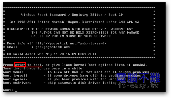 進入Offline NT Password & Registry Editor程式畫面裡,看看它英文提示。嗯……Press enter to boot…,按下Enter開機吧!