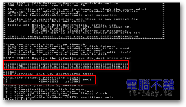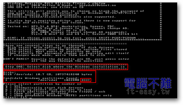 接著Offline NT Password & Registry Editor會讀取你的磁碟分割,並列出一張表,讓你選擇你主要的開機磁碟分割區。Offline NT Password & Registry Editor其實很聰明,它都已經幫你預設好了,很多動作其實只要按下Enter就好,我們看看它預設值無誤後,直接按下Enter繼續吧!