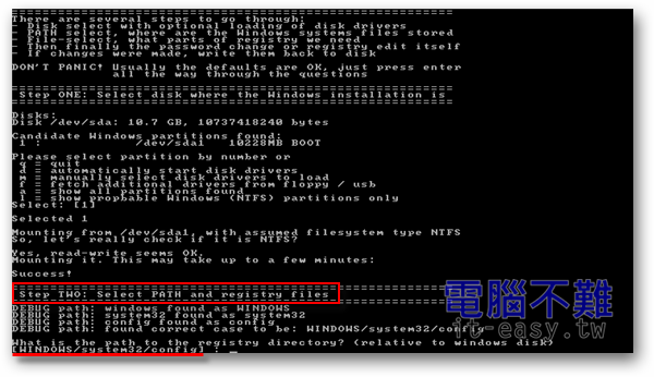 一般來說,registry的預設路徑是在windowssystem32config,我們就照Offline NT Password & Registry Editor的預設設定,直接按下Enter繼續。