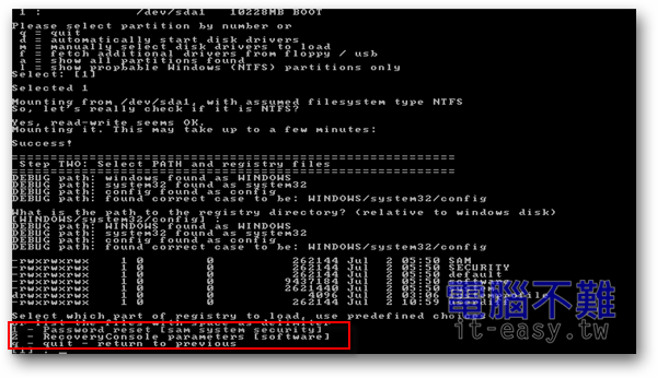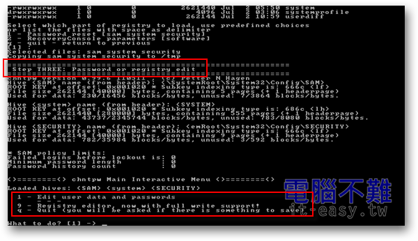接著會看到windowssystem32config路徑檔案裡的訊息,正常的話應該會有SAM檔案的存在。接著Offline NT Password & Registry Editor會叫你選擇要做的動作,我們選擇1 – Password reset [sam system security](密碼重置[sam系統安全]),輸入1,按下Enter繼續。