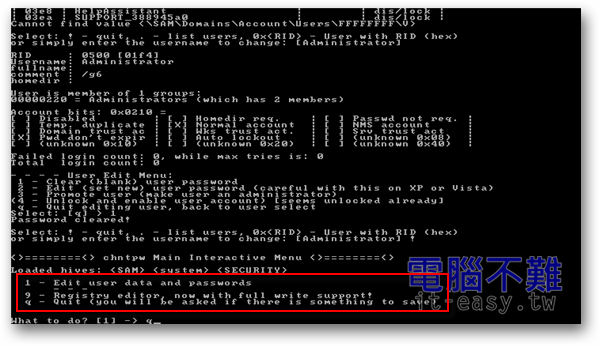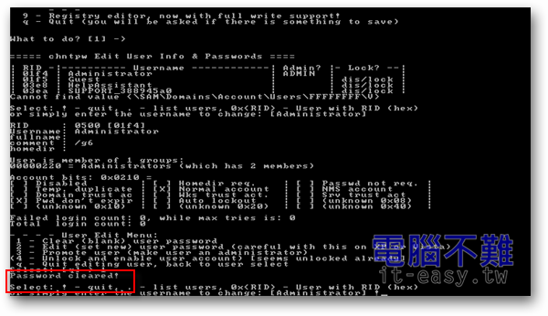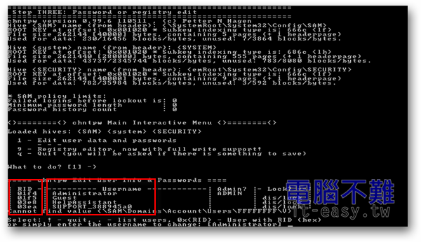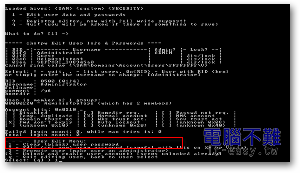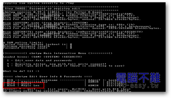 在此我們只要更變密碼而已,所以我們選擇1 – Edit user data and passwords(編輯帳戶資料和密碼),輸入1,按下Enter繼續。