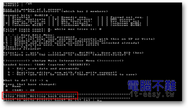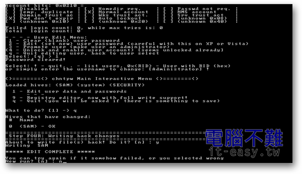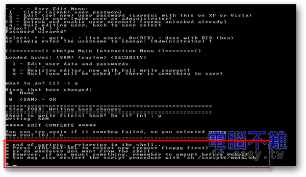 回到第三步驟的最前面,輸入q,按下Enter離開Offline NT Password & Registry Editor並儲存設定。