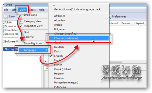 按下上方功能表單「View->Language->Chinese(Traditional)」,將語言設定為繁體中文。