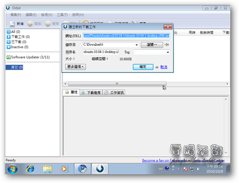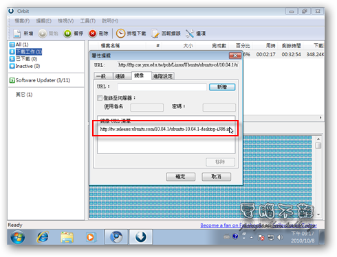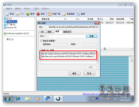 當同一個檔案有好幾個不同的直連下載點時,可以將它們全部加入Orbit的下載工作中使用,以達到多通道連接加速的目的。拿Ubuntu Live CD的下載連結來舉例,官方一共提供三個下載連結,我已先將其中一個加入下載工作中,還剩下兩個連結沒有用到。
