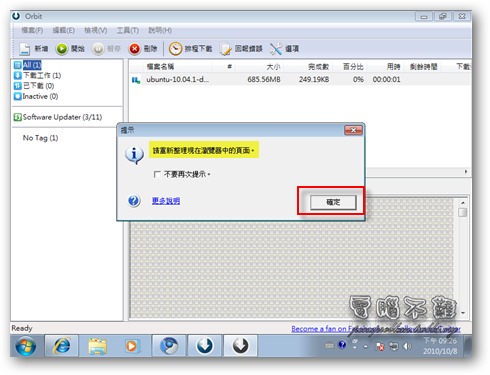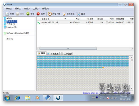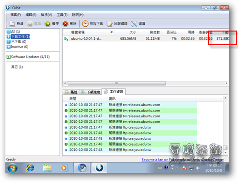 加入完畢後,便可以看到Orbit已開始連接這些鏡像連結,運氣好的話,你也會發現你的下載速度有明顯的提升。(如我,就從348~361 kb/s提升到371 kb/s)