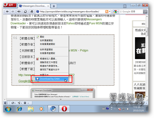 如果你的Orbit有設定支援瀏覽器,那麼在瀏覽器中,可以在檔案下載連結上按下滑鼠右鍵,選擇「Download by Orbit」,以Orbit開啟下載連結。另外這個功能也可以使用在如Megaupload的免費空間上。