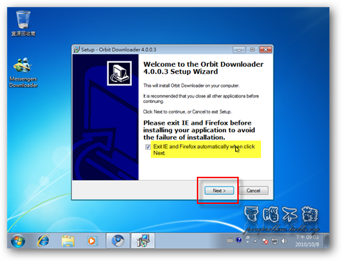 第1步 一開始執行Orbit Downloader的安裝程式時,會看到一個警告你關閉IE或是其他瀏覽器的提示。若勾選「Exit IE and Firefox automatically when click Next.」,則當你按下「Next >」按鈕進行下一個安裝步驟時,安裝程式便會自動幫你關閉IE和火狐。