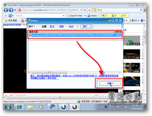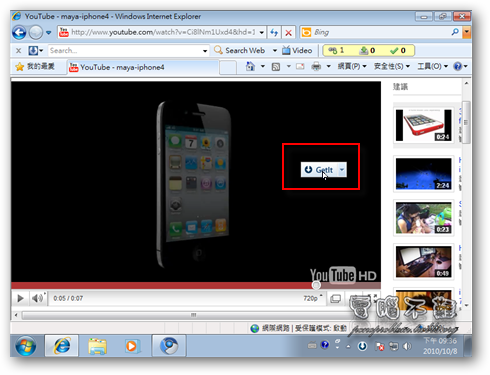 若你有為IE安裝Grab Pro工具列,則可以直接將滑鼠游標移動到想要下載的影片或是音樂上面,接著會出現「GetIt」按鈕。點下去就可以開始下載了。